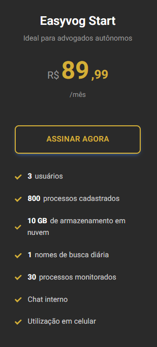 Estávamos procurando um softwares jurídico que nos atendesse em todas as funcionalidades necessárias em nosso dia a dia para gerenciamento de processos. Pois o EASYVOG foi uma grata surpresa, tanto na facilidade de de utilização, layout bastante atraente, sistema de chat interno que nos surpreendeu, e o timesheet que não tínhamos e vimos de sua importância para a correta quantificação de nossos honorários. Parabéns aos idealizadores.